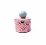 Prosta w formie cukiernica z otworem na łyżeczkę w ściance naczynia. Z uchwytem w kształcie sporej  kuli. Wykonana z wysoko palonej masy kamionkowej, szkliwo różowe w czerwone kropeczki (ręcznie malowane) plus błękitna kula.