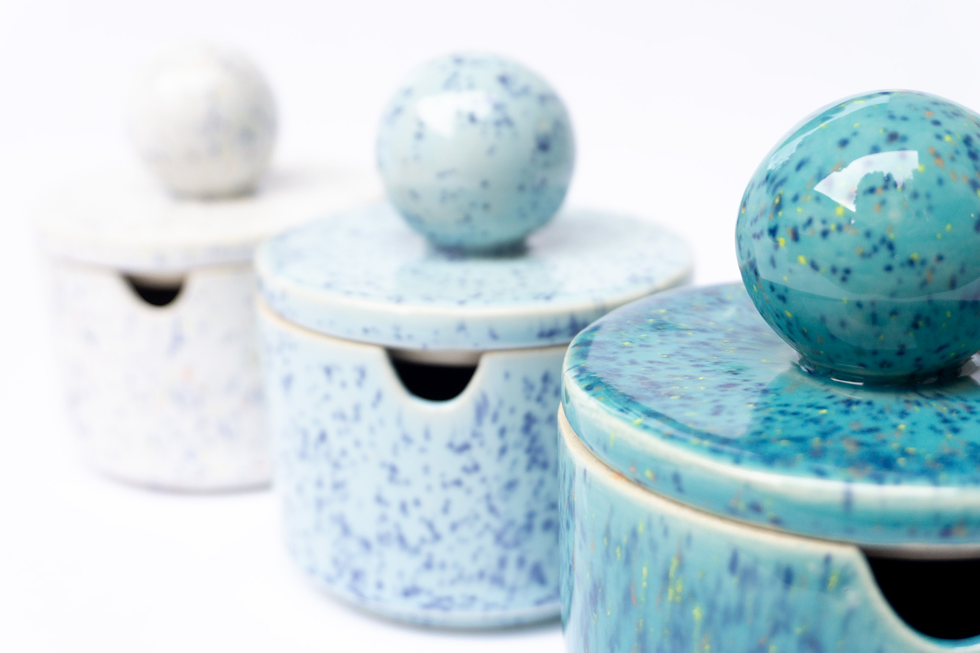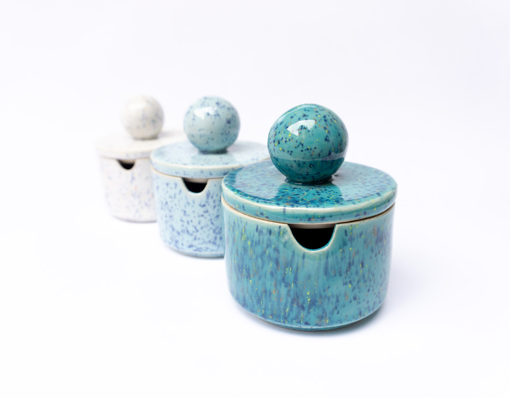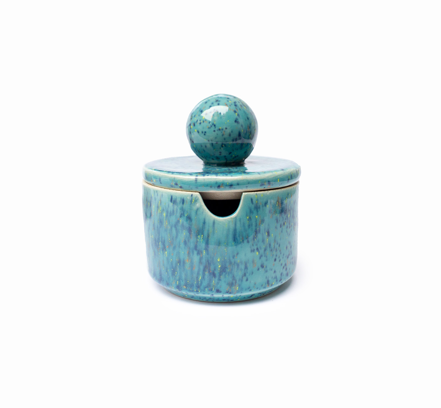 Prosta w formie cukiernica z otworem na łyżeczkę w ściance naczynia. Z uchwytem w kształcie sporej  kuli. Wykonana z wysoko palonej masy kamionkowej, szkliwo w kolorze morsko zielonym w drobny kolorowy rzucik. Wniesie dużo radości do wnętrza.