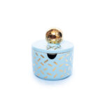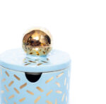 Prosta w formie cukiernica z otworem na łyżeczkę w ściance naczynia. Z uchwytem w kształcie sporej złotej kuli. Wykonana z wysoko palonej masy kamionkowej, szkliwo w kolorze błękitnym plus złote, ręcznie malowane kreseczki. Wniesie dużo radości do wnętrza.