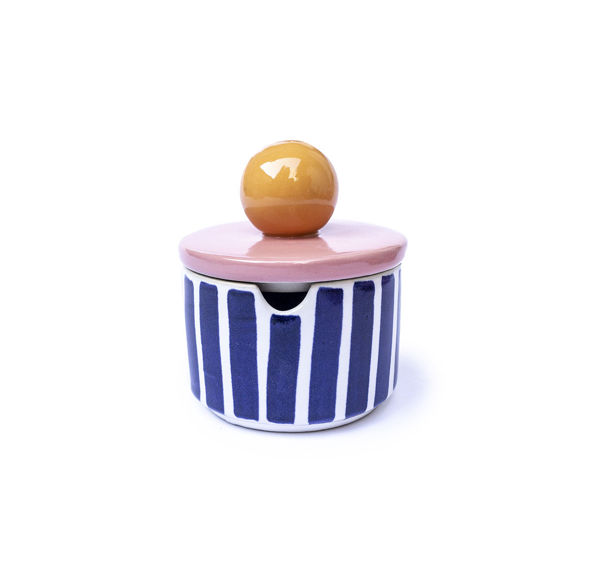 Prosta w formie cukiernica z otworem na łyżeczkę w ściance naczynia. Z uchwytem w kształcie sporej kuli. Wykonana z wysoko palonej masy kamionkowej, szkliwo białe w kobaltowe pasy (ręcznie malowane), pokrywka różowa plus pomarańczowa kula.