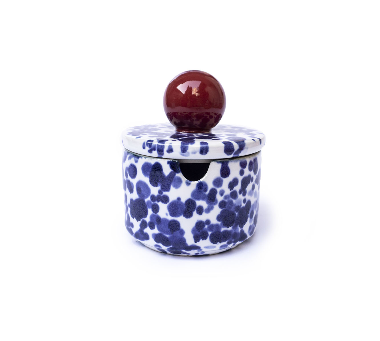 Prosta w formie cukiernica z otworem na łyżeczkę w ściance naczynia. Z uchwytem w kształcie sporej kuli. Wykonana z wysoko palonej masy kamionkowej, szkliwo białe w kobaltowe chlapki plus czerwona kula.