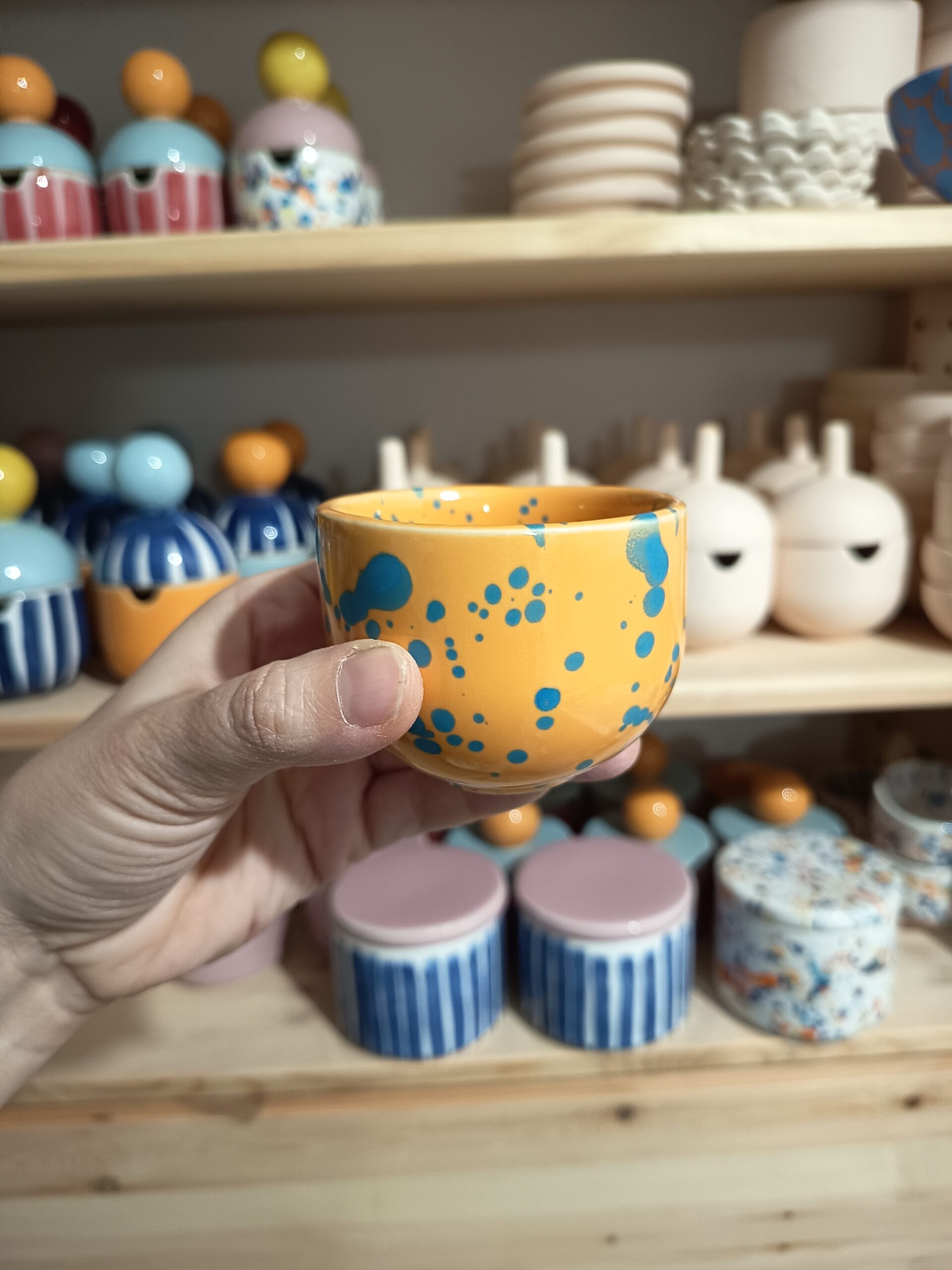 Jest kolorowa i radosna. Nieduża czarka na kawę, herbatę lub inne napoje. Miło leży w dłoni. Pomarańczowa w niebieskie chlapki.