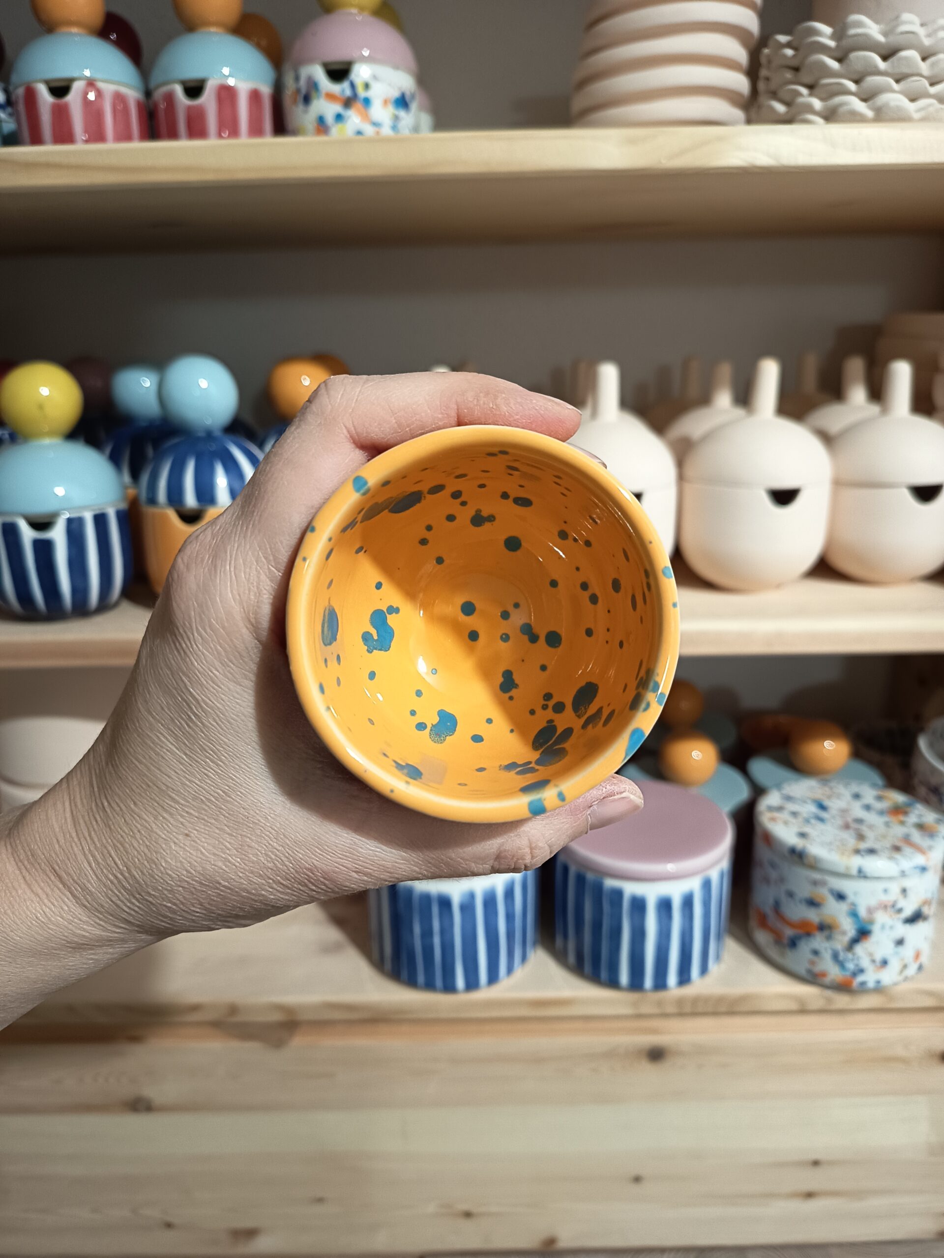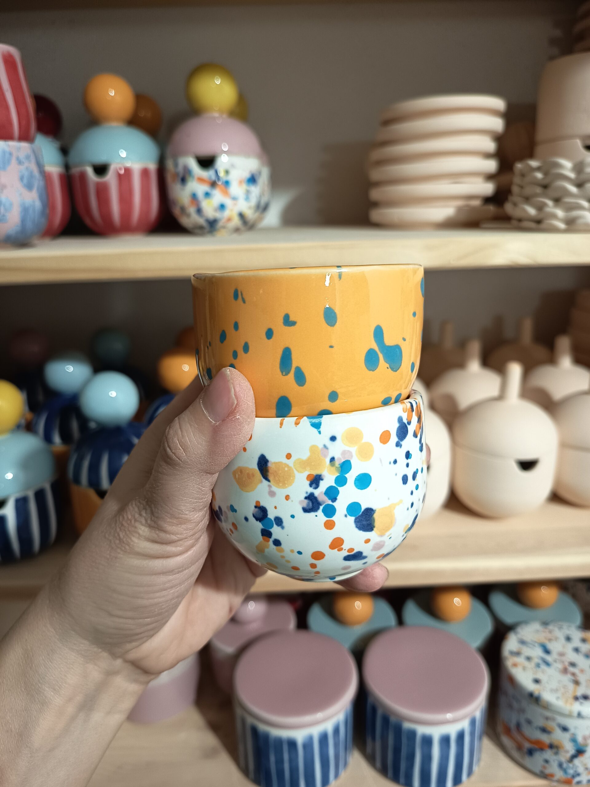 Szkliwo w kolorze białym + kolorowe chlapki.