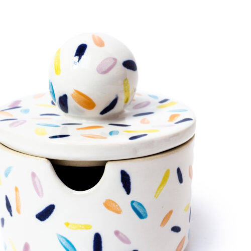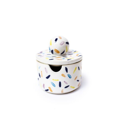 Cukiernica, pojemnik – przeznaczenie tego naczynka jest bardzo szerokie. Ma otwór na łyżeczkę. Duża kula sprawia, że pokrywka jest wygodna do podnoszenia. Odlana z jasnej masy kamionkowej, wysoko spalona. Będzie się pięknie komponowała z innymi kolorowymi naczynkami.