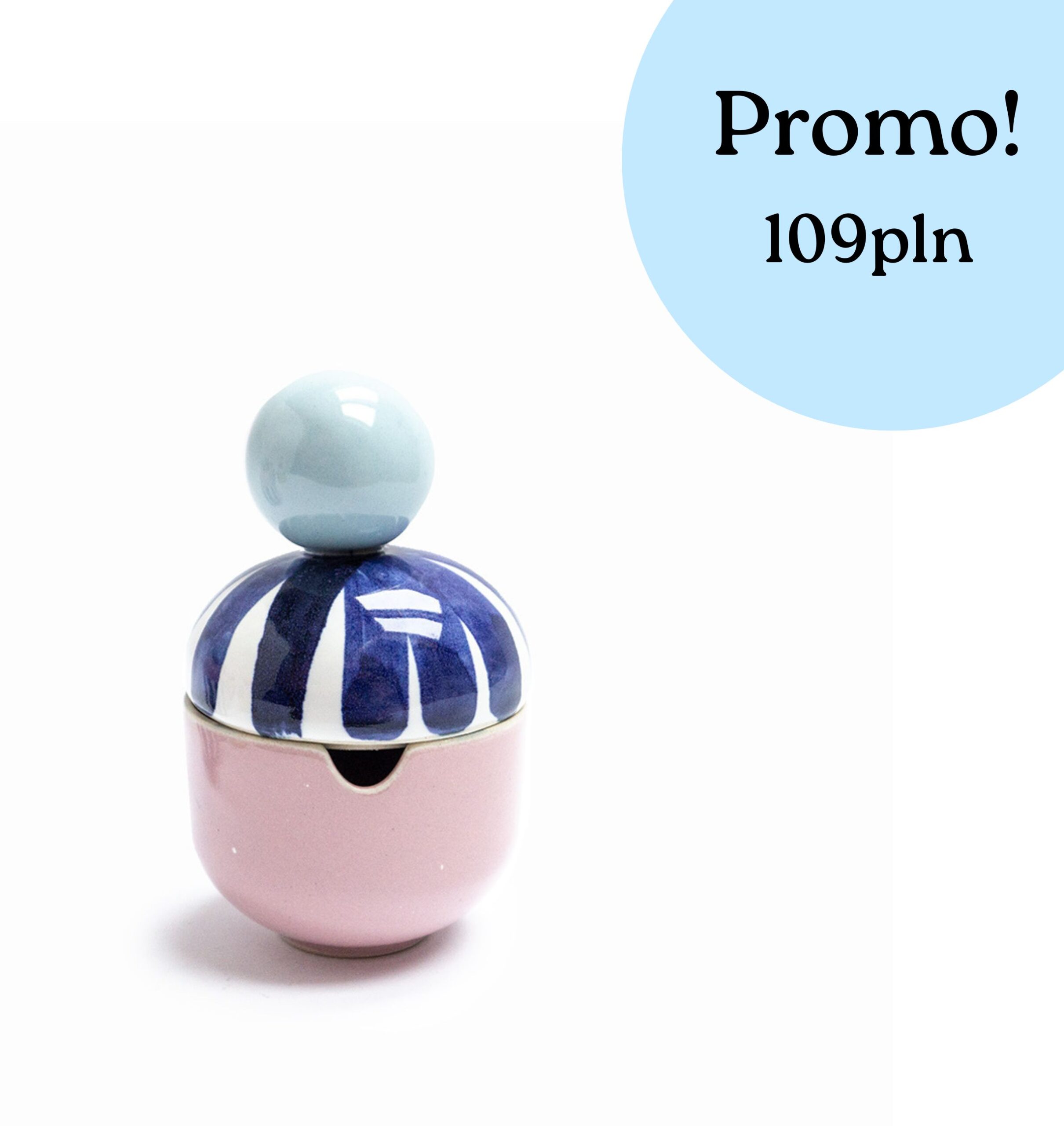 Cukiernica, pojemnik – przeznaczenie tego naczynka jest bardzo szerokie. Ma otwór na łyżeczkę. Duża kula sprawia, że pokrywka jest wygodna do podnoszenia. Odlana z jasnej masy kamionkowej, wysoko spalona. Będzie się pięknie komponowała z innymi kolorowymi naczynkami.