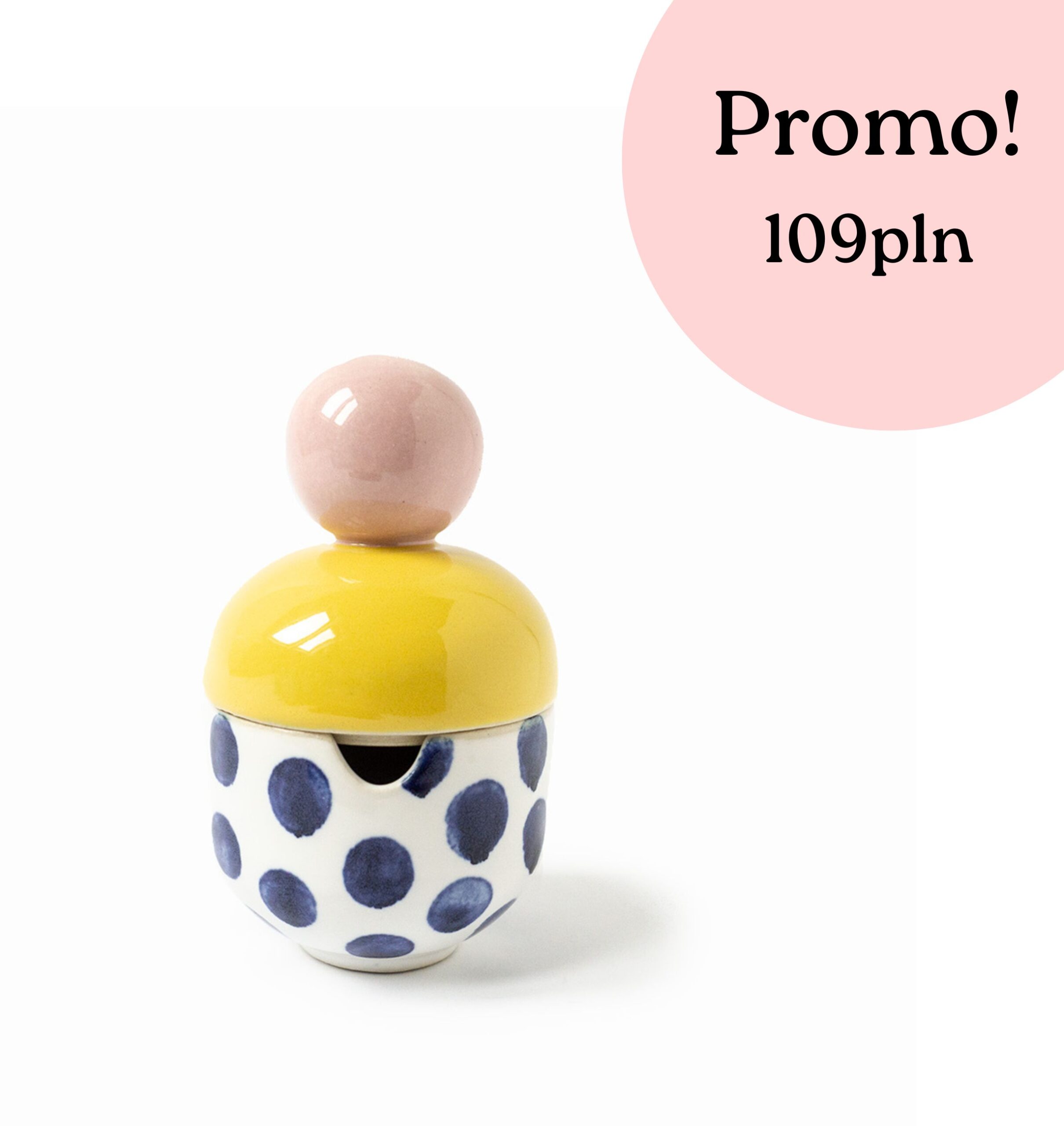 Cukiernica, pojemnik – przeznaczenie tego naczynka jest bardzo szerokie. Ma otwór na łyżeczkę. Duża kula sprawia, że pokrywka jest wygodna do podnoszenia. Odlana z jasnej masy kamionkowej, wysoko spalona. Będzie się pięknie komponowała z innymi kolorowymi naczynkami.