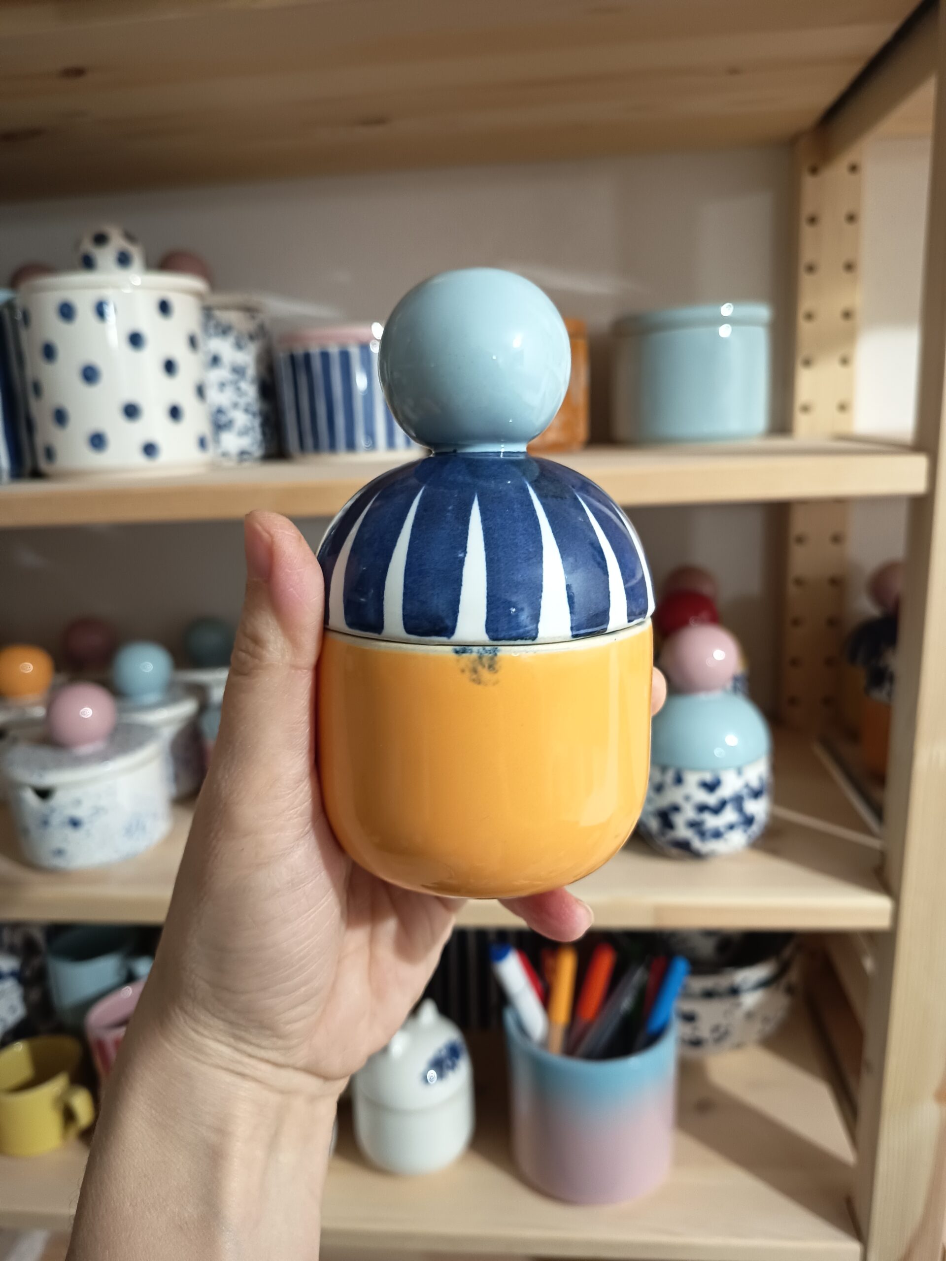 Pojemnik, cukiernica, puszka na sól lub cukierki – przeznaczenie tego naczynka jest bardzo szerokie. Nie ma otworu na łyżeczkę. Duża kula sprawia, że pokrywka jest wygodna do podnoszenia. Odlana z jasnej masy kamionkowej, wysoko spalona. Będzie się pięknie komponowała z innymi kolorowymi naczynkami.