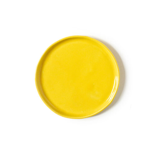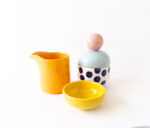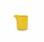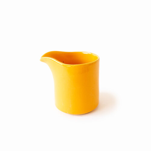 Odlany z jasnej masy kamionkowej, wysoko spalony. Szkliwo w kolorze żółtym.