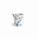 Odlany z jasnej masy kamionkowej, wysoko spalony. Szkliwo w kolorze białym plus kolorowe chlapki.
