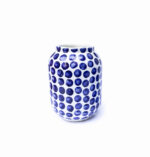 Masa kamionkowa, wysoko spalona, szkliwo w kolorze białym. Wazon jest ręcznie pomalowany w kobaltowe grochy.