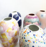 Szkliwo w kolorze różowym w czerwone paski (ręcznie malowane).